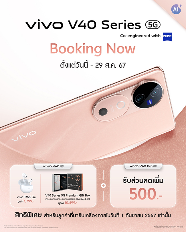 vivo V40 Series 5G ได้วันเปิดตัวอย่างเป็นทางการในประเทศไทย โดยเป็นวันที่ 29 สิงหาคม 2567 ที่จะถึงนี้ คาดว่าจะมีการเปิดตัวด้วยกัน 2 รุ่นคือ vivo V40 5G และ vivo V40 Pro 5G แน่นอนว่าทาง vivo ยังชูจุดเด่นด้านกล้องถ่ายรูป ด้วยการจับมือกับแบรนด์ ZEISS พร้อมยกระดับภาพ Portrait ที่สดใสมากขึ้น