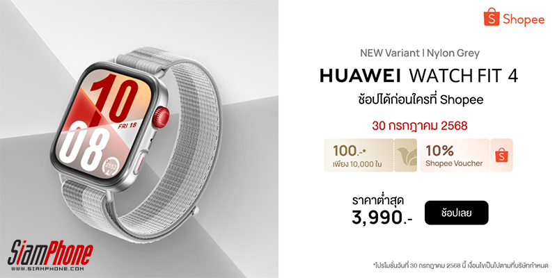 กระแสตอบรับดีเกินคาด! HUAWEI WATCH FIT 4 ได้รับความนิยมอย่างล้นหลามจากดีไซน์ล้ำ ฟีเจอร์ครบ และน้ำหนักเบา ล่าสุดเปิดตัว HUAWEI WATCH FIT 4 สีเทาใหม่! ที่มาพร้อมสายถัก 3D Nylon สีเทา กับฟีเจอร์สุขภาพและฟิตเนสแน่นๆ แบบจัดเต็ม วางจำหน่ายแบบ เอ็กซ์คลูซีฟเฉพาะที่ Shopee เท่านั้น! เพียง 3,990 บาท จากปกติ 4,990 บาท