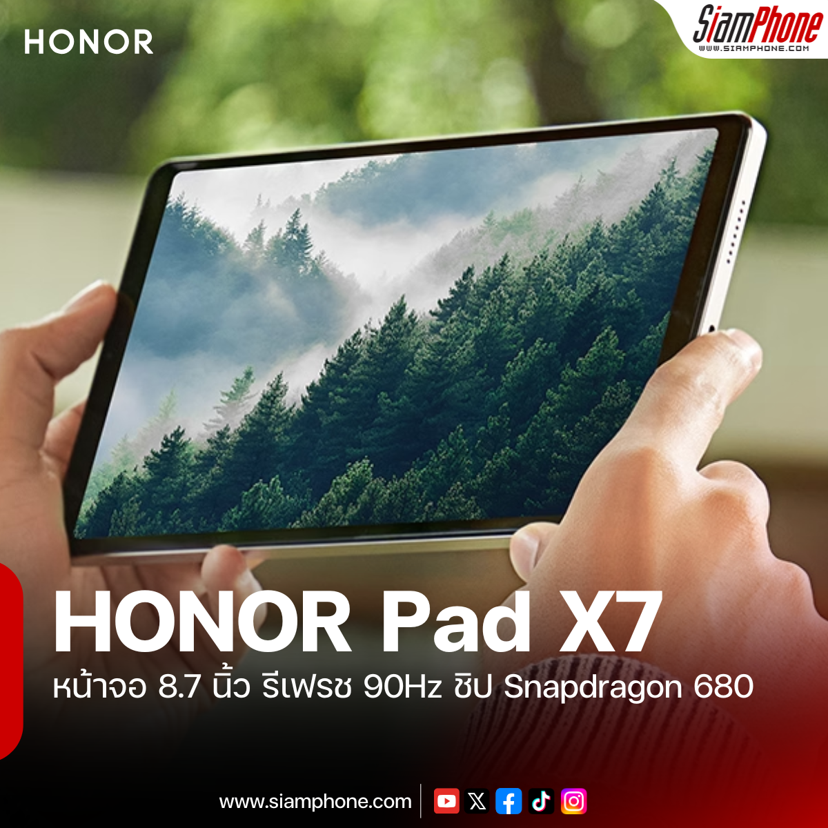 HONOR เปิดตัวแท็บเล็ตระดับเรื่มต้นรุ่นใหม่ โดยเป็น HONOR Pad X7 มีจุดเด่นที่หน้าจอแสดงผล LCD กว้าง 8.7 นิ้ว ความละเอียด 1340x800 พิกเซล อัตรา Refresh Rate สูงสุด 90Hz ภายในขับเคลื่อนด้วยชิปเซ็ต Qualcomm Snapdragon 680 ถือว่าเป็นชิปเซ็ตระดับกลางเน้นใช้งานทั่วไป ส่วนกล้องถ่ายรูปมีกล้องหน้า ความละเอียด 5MP และกล้องหลัง ความละเอียด 8MP ใช้งานคุยสายได้ชัดเจน เนื่องจากไมโครโฟนมีระบบ AI ตัดเสียงรบกวน