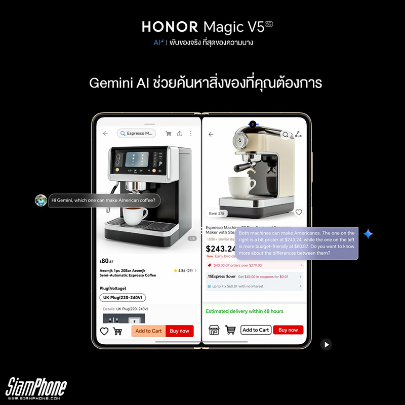 HONOR Magic V5 ไม่ได้เป็นเพียงสมาร์ตโฟนพับได้บางที่สุดในโลกเท่านั้น แต่ยังมาพร้อม Google Gemini ผู้ช่วย AI อัจฉริยะที่ติดตั้งมาในเครื่อง ช่วยให้ผู้ใช้งานทำงาน วางแผน และจัดการชีวิตประจำวันได้ง่ายขึ้นอย่างที่ไม่เคยมีมาก่อน ไม่ว่าคุณจะกำลังร่างเอกสาร คิดไอเดียใหม่ๆ หรือจัดตารางเวลาที่แน่นสุดๆ เพียงพูดคุยกับ Gemini ก็สามารถเสริมทั้งความคิดสร้างสรรค์และประสิทธิภาพการทำงานได้ทันที