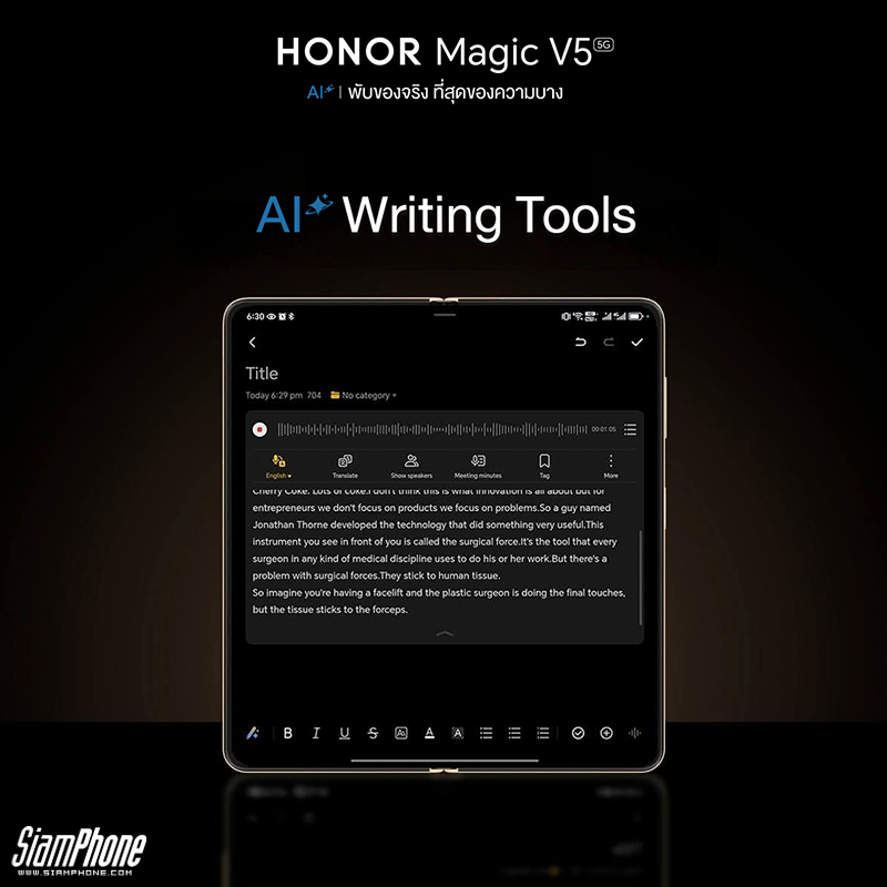HONOR Magic V5 มาพร้อม Advance AI Writing Tools พัฒนาร่วมกับ Google Gemini ให้ผู้ใช้สร้างเนื้อหาตามต้องการได้ทันที ผ่านการป้อนข้อความหรือคำสั่ง ฟีเจอร์รองรับการใช้งานหลายรูปแบบ อาทิ Smart Creation สร้างสรรค์เนื้อหาอัตโนมัติ Polishing and Rewriting ปรับปรุงหรือเขียนใหม่ให้เนื้อหาไหลลื่นCorrection ตรวจสอบและแก้ไขข้อความ Advance AI Check Spelling and Grammar ตรวจแกรมม่าและไวยากรณ์หลายภาษา และ Advance AI Rewrite Style ช่วยปรับแต่งพารากราฟหรือบทความให้เป็นสไตล์ใหม่แบบแอดวานซ์ ฟีเจอร์เหล่านี้ช่วยให้ผู้ใช้ทำงานด้านการเขียนได้ รวดเร็ว สร้างสรรค์ และมีประสิทธิภาพมากขึ้น