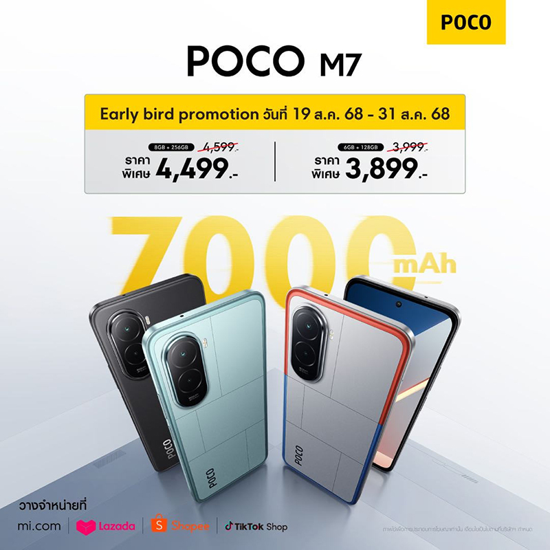 POCO M7 วางจำหน่ายในประเทศไทยอย่างเป็นทางการแล้วที่ mi.com, Lazada, Shopee และ TikTok Shop โดยมีให้เลือก 3 สี ได้แก่ Black, Blue และ Silver โดยมอบราคาพิเศษให้แก่ลูกค้าที่ซื้อสินค้าในระหว่างวันที่ 19 สิงหาคม 2568 - 31 สิงหาคม 2568 เท่านั้น