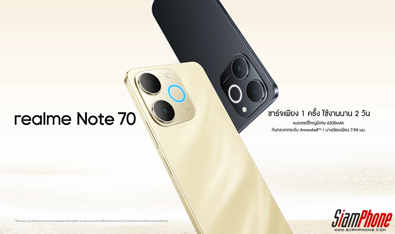 realme ประเทศไทย เปิดตัวสมาร์ตโฟนระดับเริ่มต้นรุ่นใหม่ โดยเป็น realme Note 70 เพิ่อมาสานต่อ realme Note 60 ที่ได้รับกระแสตอบรับมาอย่างดี สำหรับ realme Note 70 ยังคงเน้นเรื่องความทนทาน ด้วยการป้องกันรอบด้าน ArmorShell พร้อมผ่านการทดสอบทางทหาร MIL-STD 810H ทนการตกหล่นได้ 1.8 เมตร และยังได้มาตรฐานกันฝุ่นกันน้ำ IP54 อย่างไรก็ตามแม้ตัวเครื่องจะทนทาน แต่ก็ยังมีความบางเพียง 7.94 มิลลิเมตร แถมได้แบตเตอรี่ขนาดใหญ่ถึง 6300mAh
