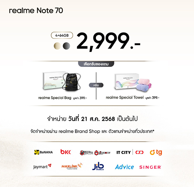 ในตอนนี้ realme Note 70 มีการเปิดตัว และวางขายในประเทศไทยอย่างเป็นทางการ สนนราคาอยู่ที่ 2,999 บาทเท่านั้น มีให้เลือก 2 สีคือ Beach Gold และ Obsidian Black สามารถหาซื้อได้ทาง realme Brand Shop และตัวแทนจำหน่ายทั่วประเทศ รวมไปถึงช่องทางออนไลน์ Shopee, Lazada, และ Tiktok