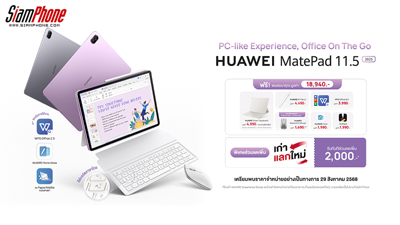 หัวเว่ย คอนซูมเมอร์ บิสสิเนส กรุ๊ป (ประเทศไทย) เตรียมเปิดตัว HUAWEI MatePad 11.5” 2025 แท็บเล็ตที่มอบประสบการณ์ใช้งานระดับพีซีที่ดีที่สุดในราคาประมาณ 10,000 บาท คุ้มค่าเหนือกว่าด้วยฟีเจอร์และประสิทธิภาพที่อัดแน่น รองรับโปรแกรม PC-Level WPS Office ที่ทำงานเอกสารได้เต็มประสิทธิภาพแบบคอมพิวเตอร์ จึงตอบโจทย์ทั้งการเรียนและการทำงานอย่างคล่องตัว พร้อม HUAWEI Notes ที่ช่วยให้การจดบันทึกเป็นเรื่องง่าย โดดเด่นด้วยจอภาพเทคโนโลยี PaperMatte ที่ลดแสงสะท้อนและถนอมสายตา พร้อมน้ำหนักเบาพกพาง่าย ให้คุณเต็มที่ได้ทุกวัน ไม่ว่าจะเรียน ทำงาน หรือความบันเทิง ติดตามราคาจำหน่ายอย่างเป็นทางการในวันที่ 29 สิงหาคม 2568 ที่ Facebook Huawei Mobile TH