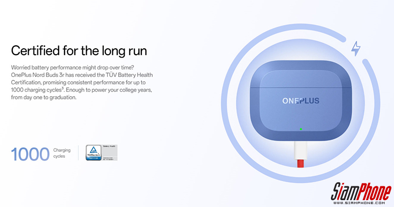 OnePlus Nord Buds 3r ยังมีจุดเด่นในเรื่องของความอึดแบตเตอรี่ สามารถใช้งานรวมเคสได้นานสุด 54 ชั่วโมง ถือว่าเป็นระยะเวลาที่นานที่สุดในบรรดาหูฟังไร้สาย TWS ของค่าย OnePlus และนังรองรับการชาร์จเร็ว เพียงชาร์จ 10 นาที ก็นำกลับมาใช้ได้นานกว่า 8 ชั่วโมง ทั้งนี้ยังได้การรับรองจาก TÜV Rheinland ในเรื่องของสุขภาพแบตเตอรี่ สามารถจับชาร์จได้มากกว่า 1,000 ครั้ง โดยที่แบตเตอรี่ไม่เสื่อม