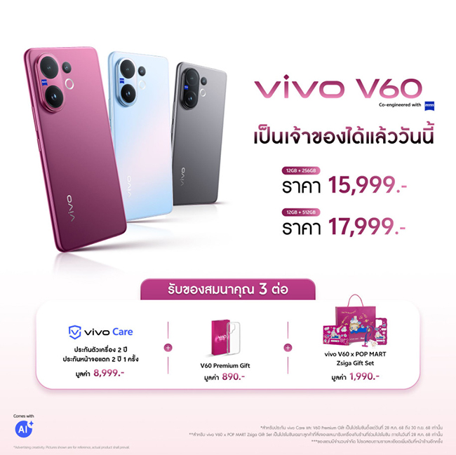สำหรับ vivo V60 ที่เปิดตัวในประเทศไทย จะมีราคาเริ่มต้นที่ 15,999 บาท (12GB+256GB) และ 17,999 บาท (12GB+512GB) มีให้เลือก 3 สีคือ Mist Gray ,Berry Purple และ Summer Blue เป็นเจ้าของได้แล้วที่ vivo Brand Shop ทุกสาขาและตัวแทนจำหน่ายทั่วประเทศ
