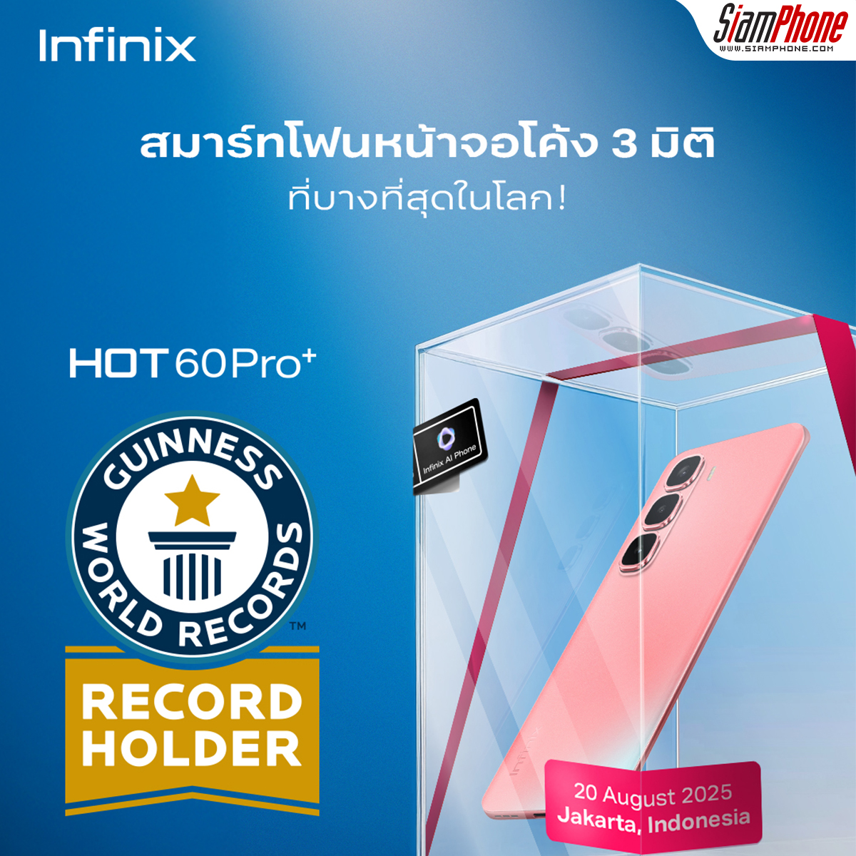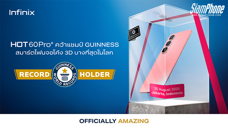 Infinix (อินฟินิกซ์) ประกาศความสำเร็จของ Infinix HOT 60 Pro+ สมาร์ทโฟนรุ่นใหม่ล่าสุดที่ได้การรับรองจาก “กินเนส เวิลด์ เรคคอร์ด” (GUINNESS WORLD RECORDS™) อย่างเป็นทางการในฐานะสมาร์ทโฟนจอโค้ง 3 มิติที่บางที่สุดในโลก ด้วยความบางเพียง 5.95 มิลลิเมตร นับเป็นหมุดหมายสำคัญที่บันทึกประวัติศาสตร์ใหม่ให้แก่อินฟินิกซ์ด้านการออกแบบสมาร์ทโฟนที่ประสบความสำเร็จในระดับโลก