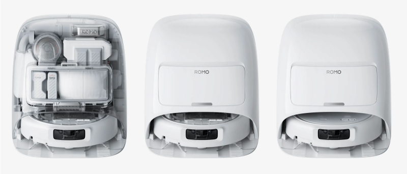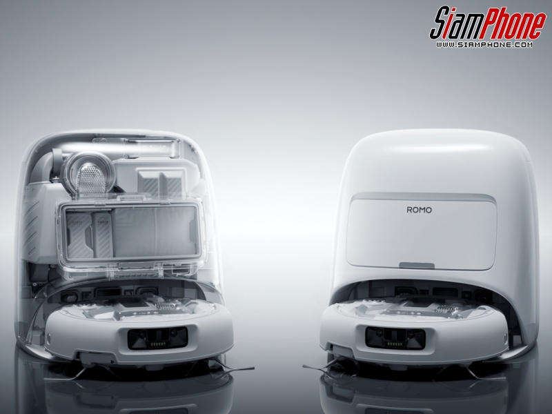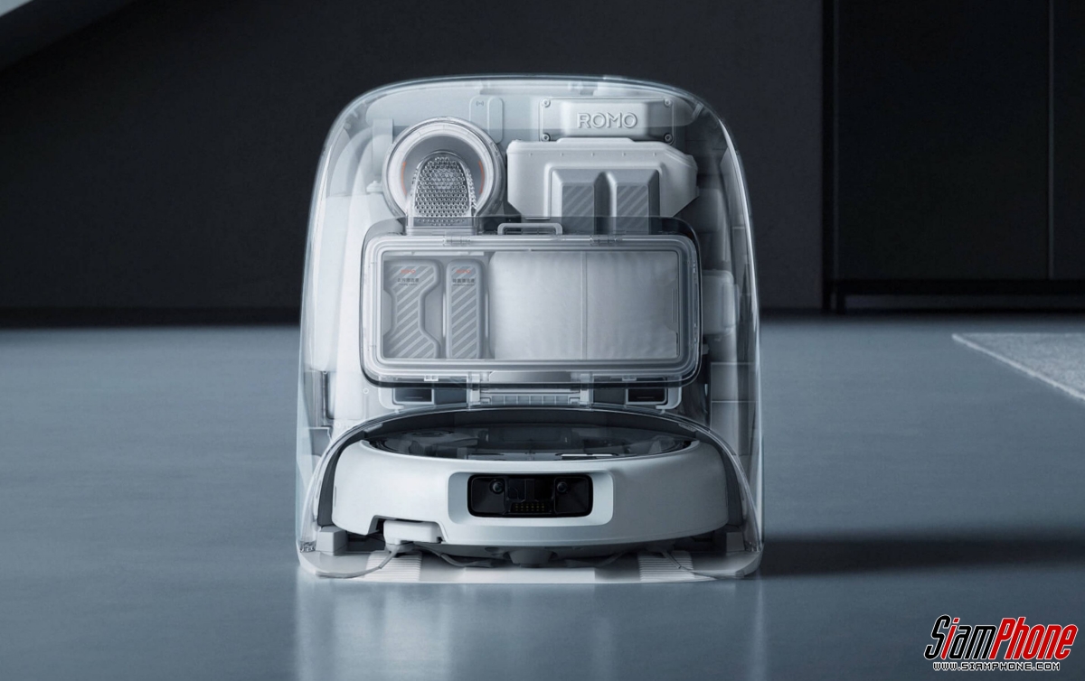 ส่วนแท่นชาร์จอัจฉริยะก็เป็นมากกว่าแค่ที่เก็บฝุ่น เพราะมันทำหน้าที่ดูแลตัวเองครบวงจร ตั้งแต่การซักผ้าถู, เติมน้ำ, ไปจนถึงการฆ่าเชื้อด้วยเทคโนโลยีซิลเวอร์ไอออน (Silver ion tech) และแผ่นกรอง UV พร้อมระบบปิดที่ช่วยกำจัดแบคทีเรียและกลิ่นไม่พึงประสงค์ และเมื่อแบตเตอรี่หมด Romo จะกลับไปชาร์จไฟที่แท่นด้วยระบบชาร์จเร็ว 55W ซึ่งใช้เวลาเพียง 2.5 ชั่วโมงก็พร้อมกลับมาทำงานต่อได้ทันที