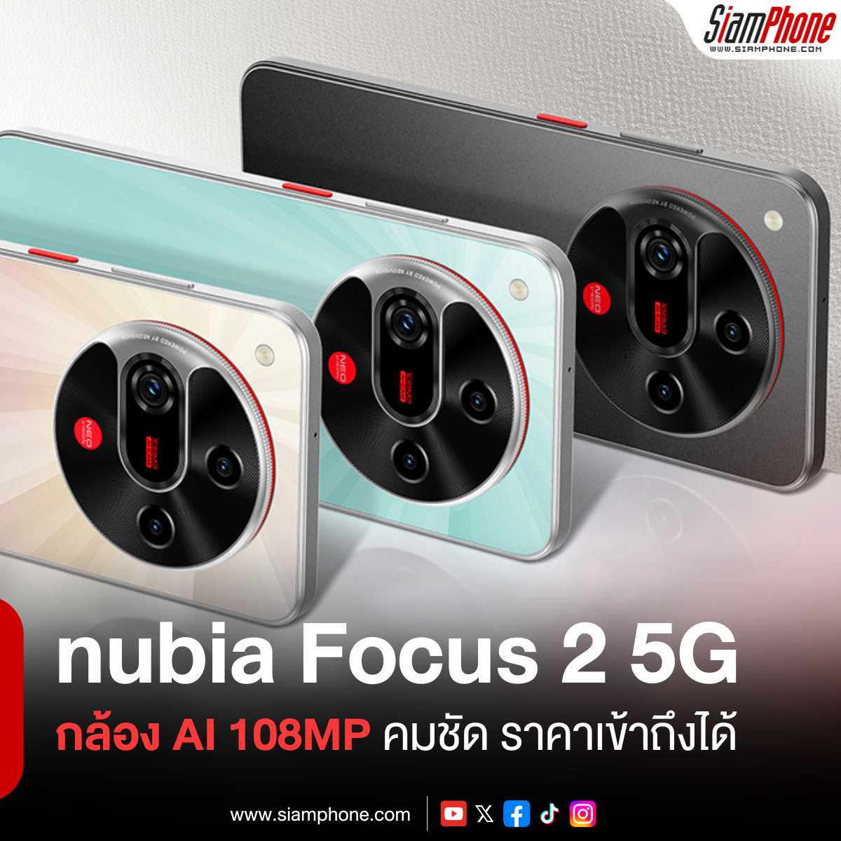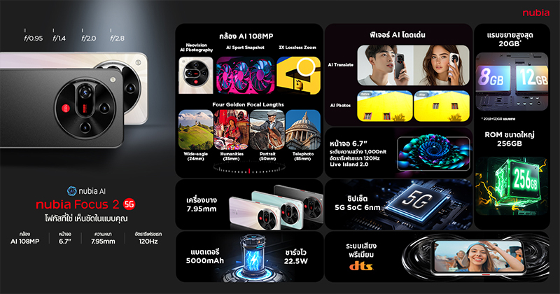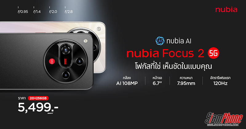 nubia เปิดตัวสมาร์ทโฟนรุ่นใหม่ล่าสุด nubia Focus2 5G อย่างเป็นทางการในประเทศไทย ชูจุดเด่นกล้อง AI ความละเอียด 108MP พร้อมระบบ Neovision AI Photography System ที่ออกแบบมาเพื่อตอบโจทย์กลุ่ม คอนเทนต์ครีเอเตอร์ รวมถึงผู้ที่ชื่นชอบการถ่ายภาพและวิดีโอโดยเฉพาะ ภายใต้สโลแกน “Focus on your Vision โฟกัสที่ใช่ เห็นชัดในแบบคุณ” ในราคาจับต้องได้เพียง 5,499 บาท