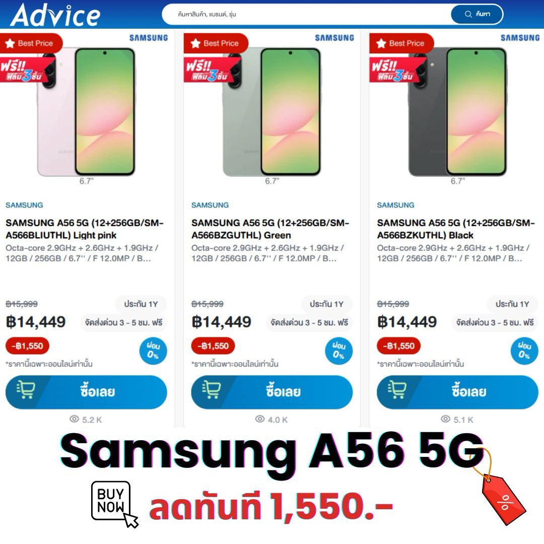 ตอนนี้ Advice วางจำหน่าย Samsung Galaxy A56 5G รุ่น 12+256GB ในราคาเพียง 14,449 บาท (จากราคาปกติ 15,999 บาท) ถือว่าคุ้มมากสำหรับมือถือที่ได้ทั้งจอ AMOLED 120Hz, RAM 12GB, กล้องหลัง 3 ตัว และแบตอึด 5,000mAh ในเครื่องเดียว