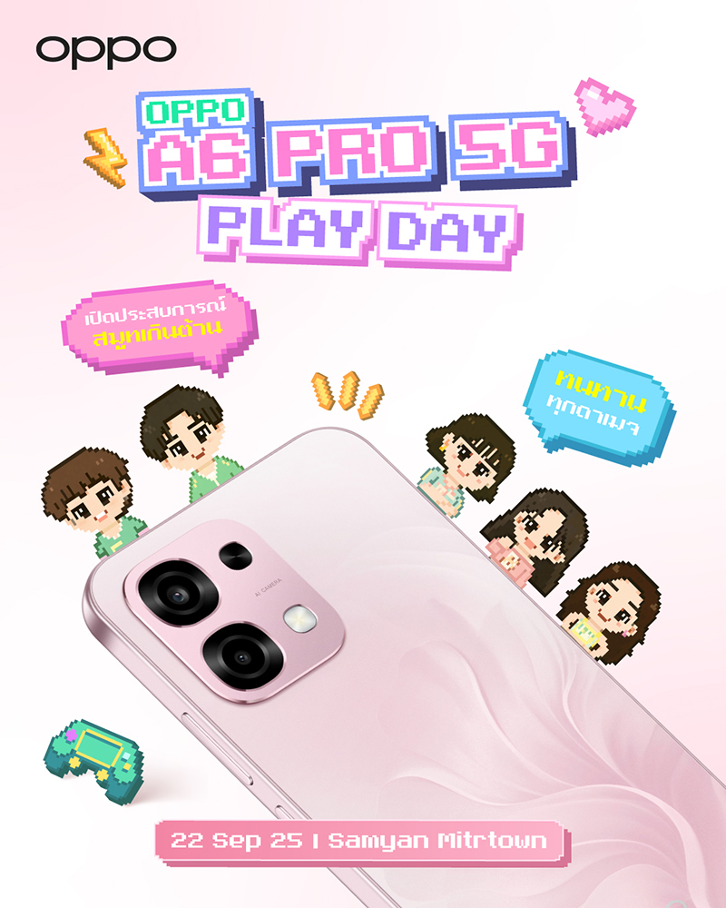 เตรียมพบกับงาน “OPPO A6 Pro 5G Play Day เปิดประสบการณ์สมูทเกินต้าน ทนทานทุกดาเมจ” พร้อมร่วมสนุกไปกับมินิคอนเสิร์ตสุดพิเศษจากสาวๆ วง PiXXiE ที่จะมาสร้างสีสันและความสนุกแบบจัดเต็ม! พร้อมร่วมเล่นเกมสุดท้าทายกับสองนักแสดงหนุ่ม โทมัสและก้องที่จะมาดวลความมันส์ เพื่อพิสูจน์ความลื่นไหลของสมาร์ตโฟน OPPO A6 Pro 5G ในวันที่ 22 กันยายนนี้เท่านั้น