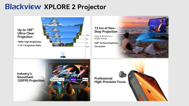 ลืมภาพสมาร์ตโฟนทนๆ ที่มีแต่ฟังก์ชันพื้นฐานไปได้เลย เพราะ XPLORE 2 Projector คือการปฏิวัติวงการอย่างแท้จริง ด้วยโปรเจคเตอร์ความสว่าง 100 ลูเมน ที่สามารถฉายภาพได้ใหญ่ถึง 100 นิ้ว ด้วยอัตราส่วนการฉาย 1.13:1 พร้อมความลื่นไหลระดับ 120FPS ซึ่งสูงกว่าโปรเจคเตอร์ทั่วไปถึง 3 เท่า ทำให้ไม่ว่าจะดูหนังแอ็คชั่นหรือเล่นเกม ก็ไม่มีสะดุด มาพร้อมปุ่มปรับโฟกัสความแม่นยำสูง, การแก้ไขภาพสี่เหลี่ยมคางหมูแนวตั้ง ±40°, ระบบระบายความร้อนประสิทธิภาพสูงที่ทำงานเงียบเพียง 40dB และรักษาอุณหภูมิเครื่องให้ต่ำกว่า 38°C เสริมทัพด้วยลำโพง Smart-K Box 2W ในตัวที่ดังกระหึ่ม ให้คุณดูหนังต่อเนื่องได้นานถึง 13 ชั่วโมงด้วยแบตเตอรี่สุดอึด