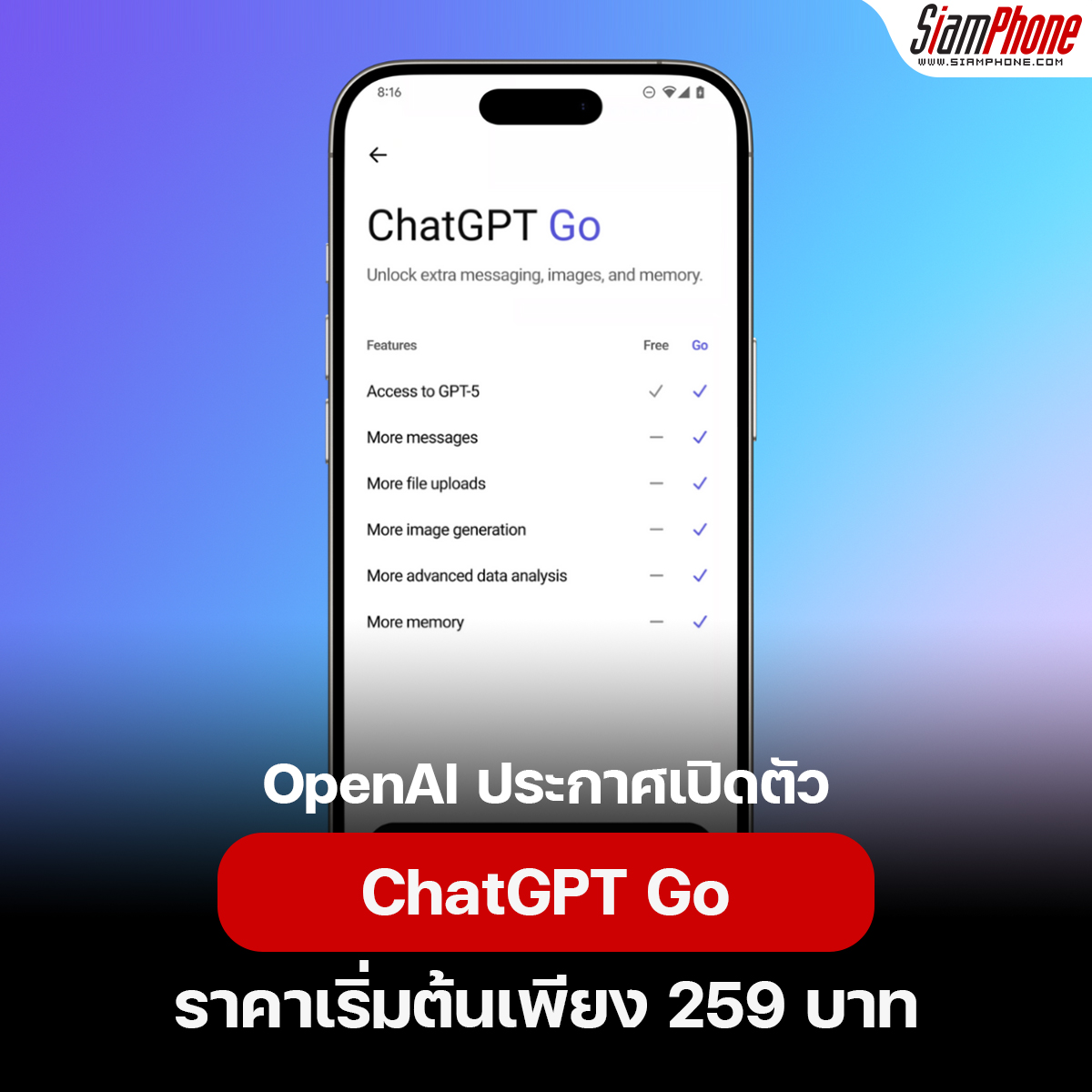 ChatGPT Go มีราคาเพียง 259 บาทต่อเดือน* มาพร้อมกับฟีเจอร์ยอดนิยมของ ChatGPT ให้ผู้ใช้ในไทย ทั้งขีดจำกัด (Limit) การส่งข้อความที่เพิ่มขึ้น การสร้างภาพ การอัปโหลดไฟล์ และหน่วยความจำ ที่ทั้งหมดจะขับเคลื่อนด้วย GPT-5 ซึ่งเป็นโมเดลที่ล้ำสมัยที่สุดของ OpenAI