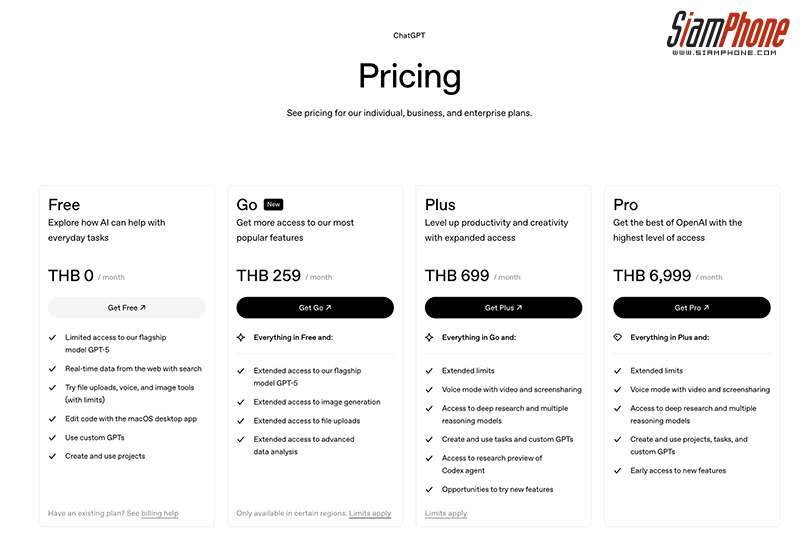 ChatGPT Go เป็นหนึ่งในตัวเลือกแผนสมาชิก (Subscription) พร้อมตัวเลือกอื่นๆ ดังนี้