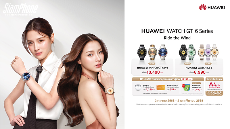 พิเศษ! เมื่อซื้อระหว่าง 2 ตุลาคม 2568 – 2 พฤศจิกายน 2568 รับของสมนาคุณมูลค่ารวมสูงสุด 8,146 บาท อาทิ HUAWEI FreeBuds 6i (สีขาว) มูลค่า 4,299 บาท, HUAWEI Health+ Membership 3 เดือน มูลค่า 357 บาท และฟีเจอร์กอล์ฟระดับพรีเมียม มูลค่า 3,490 บาท (เฉพาะรุ่น HUAWEI WATCH GT 6 Pro เท่านั้น) พร้อมประกันภัย ALive Powered by AIA คุ้มครองชีวิตจากการเจ็บป่วยและอุบัติเหตุ 1 ปี สูงสุด 200,000 บาท