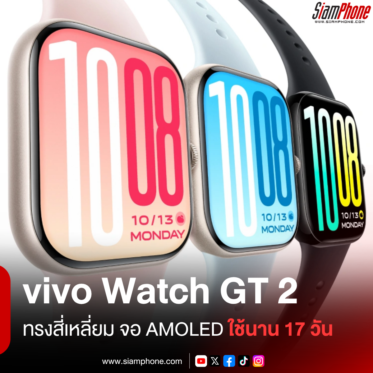 vivo เปิดตัวสมาร์ตวอทช์รุ่นใหม่ในประเทศจีน โดยเป็น vivo Watch GT 2 สมาร์ตวอทช์ทรงสี่เหลี่ยม มีแป้นหมุน Digital crown อยู่ทางขวา และมีสายรัดข้อมือแบบยาง ส่วนจุดเด่นอยู่ที่หน้าจอแสดงผล AMOLED กว้างถึง 2.07 นิ้ว ปรับความสว่างได้สูงสุด 2400nits รองรับโหมด Always On Display พร้อมแบตเตอรี่ขนาด 695mAh ใช้งานทั่วไปได้นานสุด 17 วัน
