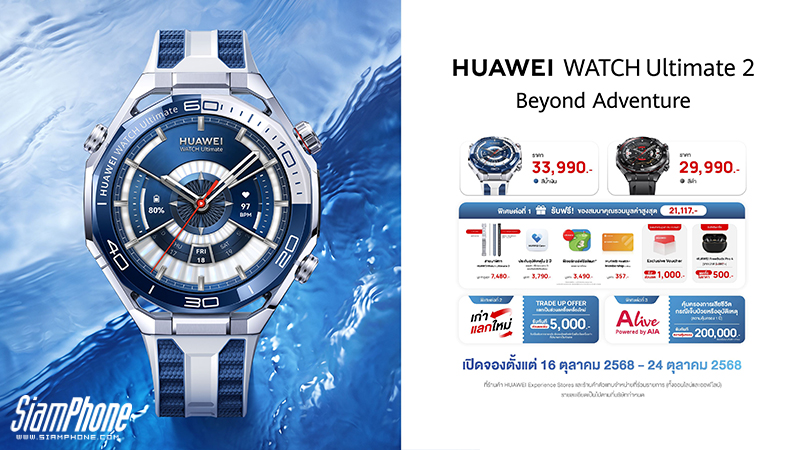 เตรียมยกระดับประสบการณ์การใช้สมาร์ทวอทช์สำหรับคอกิจกรรมเอ็กซ์ตรีม ด้วยการเปิดตัว HUAWEI WATCH Ultimate 2 สมาร์ทวอทช์สุดพรีเมียมที่ผสานความหรูหราเข้ากับสมรรถนะเหนือระดับ ครั้งแรกของโลกกับความสามารถในการดำน้ำลึกถึง 150 เมตร พร้อมฟีเจอร์การสื่อสารใต้น้ำแบบอิสระ และระบบตรวจวัดค่าสุขภาพครบวงจรระดับโปรเพียงปลายนิ้ว พร้อมเปิดพรีออเดอร์ให้จับจองตั้งแต่วันพฤหัสบดีที่ 16 ตุลาคม 2568 – วันศุกร์ที่ 24 ตุลาคม 2568 โปรโมชันสุดเอ็กซ์คลูซีฟ ในราคาเริ่มต้น 29,990 บาท พร้อมรับของสมนาคุณและสิทธิประโยชน์มากมาย