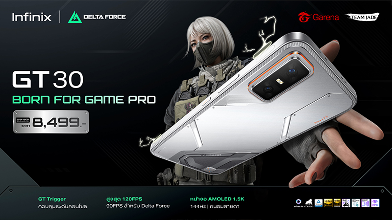 อินฟินิกซ์ (Infinix) ประกาศเปิดตัว Infinix GT 30 อย่างเป็นทางการทั่วโลก เสริมทัพตระกูล เสริมทัพซีรีส์ GT ด้วยสมาร์ทโฟนเกมมิ่งดีไซน์พรีเมียม ที่ผสานเทคโนโลยีระดับแข่งขันเข้ากับประสิทธิภาพการเล่นเกมขั้นสุด โดดเด่นด้วย ปุ่มสัมผัส GT Trigger (Capacitive Shoulder Triggers) ช่วยให้ควบคุมเกมได้อย่างแม่นยำ และ หน้าจอ AMOLED ความละเอียด 1.5K รีเฟรชเรต 144Hz มอบภาพคมชัด สีสันสด และการตอบสนองที่ลื่นไหลทุกจังหวะการเล่น