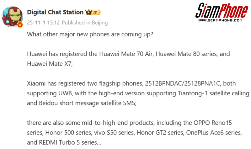 แต่ความพีคอยู่ที่รุ่นท็อป! คาดว่าจะมาพร้อมฟีเจอร์การเชื่อมต่อผ่านดาวเทียมคู่ (Dual Satellite Connectivity) ซึ่งประกอบด้วย การโทรผ่านดาวเทียม Tiantong และการส่งข้อความสั้นผ่านดาวเทียม Beidou