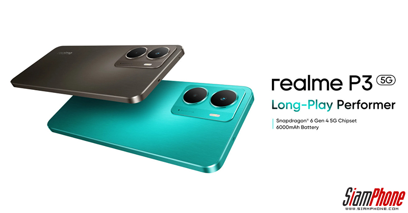 realme P3 5G สมาร์ทโฟนเกมมิ่งสเปกแรง ชิปเซ็ต Snapdragon 6 Gen 4 ประสิทธิภาพสูง รองรับการเล่นเกมลื่นไหลต่อเนื่อง จอแสดงผล AMOLED กว้าง 6.67 นิ้ว FHD+ อัตรารีเฟรชเรท สูงสุด 120Hz พร้อมแบตเตอรี่ขนาดใหญ่ 6000mAh ใช้งานได้ยาวนาน ไม่ต้องหยุดชาร์จบ่อย realme P3 5G มีมาให้เลือก 2 สีคือ Starlight Green และ Comet Grey