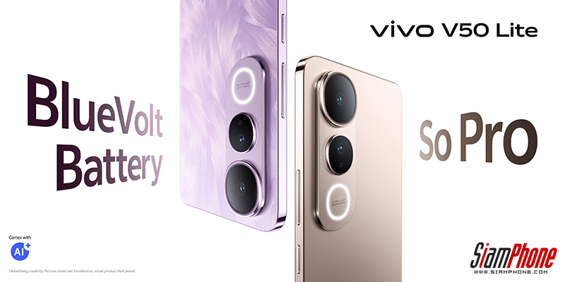 vivo V50 Lite 5G มือถือ ถึก อึด ทน มาตรฐานทางทหาร หน้าจอ AMOLED อัตรารีเฟรชเรท 120Hz ขนาด 6.77 นิ้ว กันน้ำกันฝุ่น IP65 กล้องคู่ 50MP Sony IMX882 มีแสงแฟลช Aura Light พร้อมกับซอฟต์แวร์ AI ที่ชาญฉลาด ชิป Dimensity 6300 แบตเตอรี่ความจุ 6500mAh และเทคโนโลยีชาร์จเร็ว 90W FlashCharge มี 3 เฉดสีให้เลือก ได้แก่ Titanium Gold, Fantasy Purple และ Phantom Black