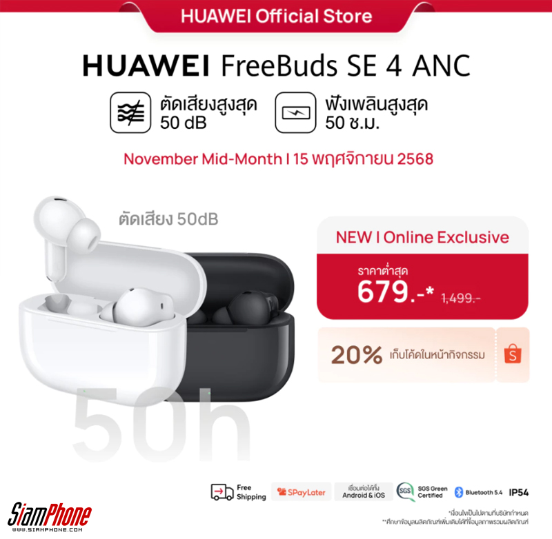 HUAWEI FreeBuds SE4 ANC พร้อมจำหน่ายแล้ววันนี้ที่ Shopee พร้อมของแถมพิเศษสำหรับ 200 ออเดอร์แรก สำหรับผู้ที่ต้องการหูฟังไร้สายคุณภาพพรีเมียมในราคาที่คุ้มค่า สบายกระเป๋า ติดตามรายละเอียดและโปรโมชันอื่นๆ เพิ่มเติมได้ทาง Facebook Huawei Mobile TH รวมทั้งข้อมูลเกี่ยวกับการสินค้าและบริการ ง่ายๆ ในคลิกเดียว เพียงดาวน์โหลดแอปพลิเคชัน My HUAWEI ใน AppGallery