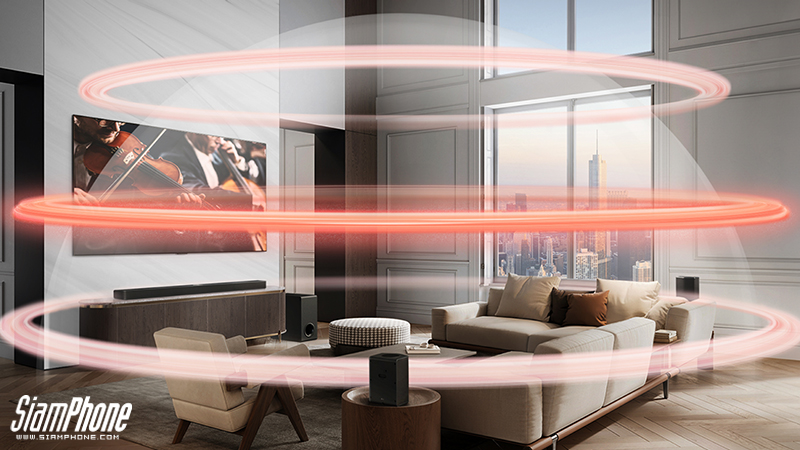 ด้วยระบบเสียงรอบทิศทาง 9.1.5 แชนแนล พร้อมกำลังขับรวม 810 วัตต์ ลำโพงยิงขึ้นด้านบนถึง 5 แชนแนล จึงมอบคุณภาพเสียงสูงสุด โดยไม่ต้องกังวลว่าเสียงพูดจะถูกกลบ เพราะมี Center Up-firing Channel ลำโพงตัวกลางยิงเสียงพุ่งขึ้นด้านบน เพื่อเพิ่มความคมชัดของเสียงพูด เสริมด้วยลำโพงเซอร์ราวด์หลังแบบไร้สาย 6 แชนแนล ที่มาพร้อมลำโพงยิงขึ้นด้านบนด้วยเช่นกัน โดยลำโพงหน้าทำมุม 135° จึงปล่อยเสียงให้กระจายออกไปอย่างกว้างขวาง คุณจึงสัมผัสได้ถึงเสียงรอบทิศทาง