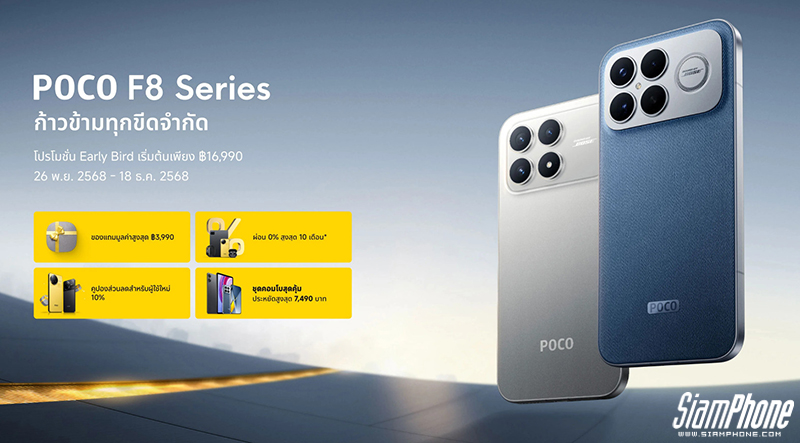 แม้ว่า POCO F8 Series จะมีการเปิดตัวในเมืองบาลี ประเทศอินโดนิเซีย ในวันที่ 26 พฤศจิกายน 2025 แต่ทาง POCO ประเทศไทยก็ไม่รอช้า ประกาศโปรโมชั่น Early-Bird พร้อมราคาแบบพิเศษๆ ให้ทันที และจะพามาทั้งหมด 2 รุ่นคือ POCO F8 Pro และ POCO F8 Ultra