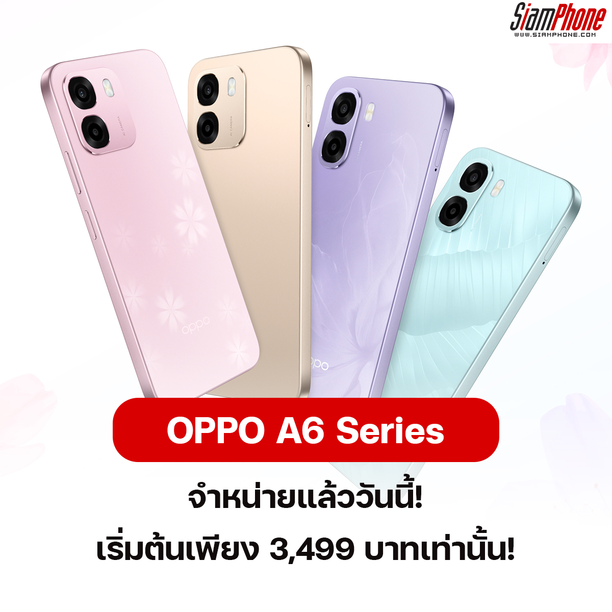 OPPO A6 Series สมาร์ตโฟนสมูทเกินต้าน ทนทานทุกดาเมจ วางจำหน่ายอย่างเป็นทางการแล้ววันนี้ สมาร์ตโฟนจากตระกูลซีรีส์ A มาใน 4 รุ่น ได้แก่ OPPO A6 5G, OPPO A6, OPPO A6x 5G และ OPPO A6x สมาร์ตโฟนที่มาพร้อมประสบการณ์ทนทานทุกดาเมจ ครอบคลุมทุกการใช้งาน ในราคาสุดคุ้มค่า เริ่มต้นเพียง 3,499 บาทเท่านั้น