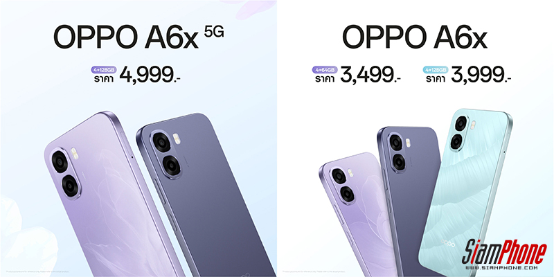 OPPO A6 Series มาพร้อมกัน 4 รุ่น ได้แก่ OPPO A6 5G, OPPO A6, OPPO A6x 5G และ OPPO A6x สมาร์ตโฟนซีรีส์นี้พร้อมมอบประสบการณ์ทนทานทุกดาเมจ ครอบคลุมทุกการใช้งาน ด้วยแบตเตอรี่ขนาดใหญ่สูงสุด 7,000mAh ทนทานใช้งานยาวนานกว่า 5 ปี พร้อมชาร์จไว 45W SUPERVOOC ใช้งานได้ยาวนานตลอดวัน พร้อมทั้งยังทนทานด้วยมาตรฐานกันน้ำกันฝุ่นสูงสุดถึงระดับ IP69 มอบประสบการณ์ทนทานทุกดาเมจ พร้อมหน้าจอสว่างพิเศษพร้อมอัตรารีเฟรช 120Hz ลื่นไหลคมชัด ทุกการเคลื่อนไหว เล่นเกมสุดมัน เฟรมเรตไม่ตก ด้วยระบบระบายความร้อน SuperCool VC น้ำหนักเบา บางเฉียบ พกพาง่าย มอบความรู้สึกจับสบายมือ และดีไซน์สไตล์แฟลกชิป