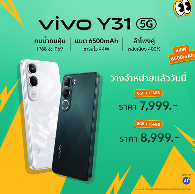 vivo Y31 5G สมาร์ตโฟน 5G รุ่นใหม่จากแบรนด์ vivo มีการเปิดตัวอย่างเป็นทางการในประเทศไทย โดยมีจุดเด่นในเรื่องความทนทานรอบด้าน ได้มาตรฐานกันน้ำกันฝุ่น IP68 & IP69 ทนน้ำลึก 1.5 เมตรได้ 30 นาที และยังผ่านการทดสอบระดับทหาร รวมไปถึงได้การรับรองการกันกระแทกระดับ 5 ดาวจาก SGS ส่วนหน้าจอแสดงผลมีการครอบทับกระจก Guardian ป้องกันการขีดขวนให้อีกชั้น และ vivo Y31 5G ยังอึดทนมายังแบตเตอรี่ เพราะมีขนาดใหญ่ถึง 6500mAh รองรับชาร์จเร็วผ่านสาย 44W