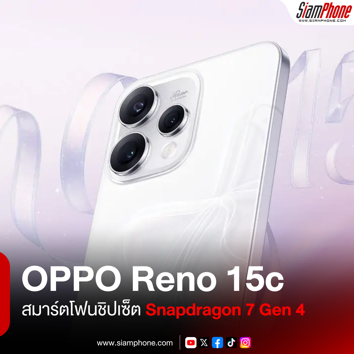OPPO Reno 15c อีก 1 สมาร์ตโฟนใน OPPO Reno 15 Series มีการเปิดตัวอย่างเป็นทางการในประเทศจีน โดยมาพร้อมชิปเซ็ต Qualcomm Snapdragon 7 Gen 4 ทำงานร่วมกับ RAM แบบ LPDDR5x และ ROM แบบ UFS 3.1 พร้อมกับหน้าจอแสดงผล AMOLED กว้าง 6.59 นิ้ว ความละเอียด 2760x1256 พิกเซล อัตรา Refresh Rate สูงสุด 120Hz อัตรา ความสว่างได้สูงสุด 1200nits และรองรับการสแกนลายนิ้วมือบนหน้าจอ