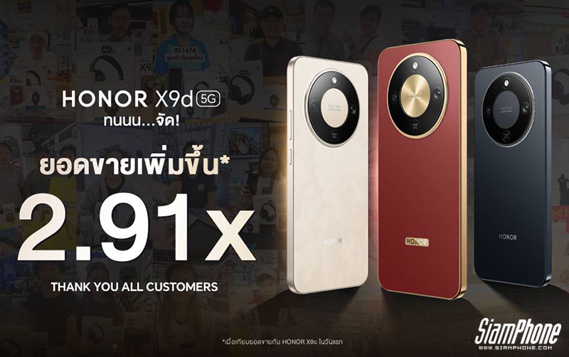 ออเนอร์ (HONOR) ประกาศความสำเร็จล่าสุดกับสมาร์ตโฟนรุ่นใหม่ ‘HONOR X9d 5G’ ที่สร้างปรากฏการณ์ใหม่ในตลาดสมาร์ตโฟนไทย ด้วยสถิติยอดขายเติบโตอย่างก้าวกระโดด เพิ่มขึ้นถึง 2.91 เท่า! เมื่อเทียบกับรุ่นก่อนหน้าในวันแรกของการวางจำหน่าย สะท้อนความเชื่อมั่นของผู้บริโภคที่มีต่อแบรนด์ ทั้งในด้านนวัตกรรมความทนทานและคุ้มค่า