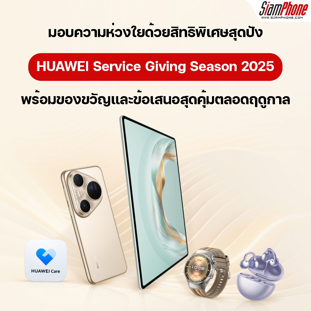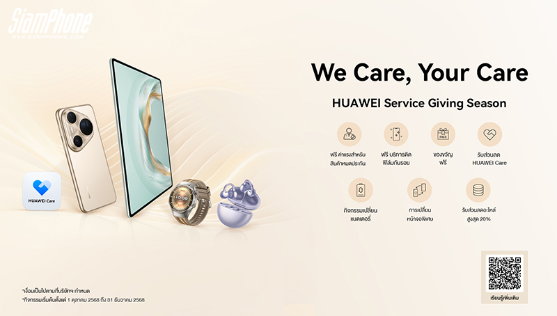 นอกจากการบริการอย่างต่อเนื่อง หัวเว่ยยังสร้างสรรค์ฤดูกาลแห่งการให้ภายใต้ชื่อแคมเปญ HUAWEI Service Giving Season 2025 ขึ้นเป็นประจำทุกสิ้นปี เพื่อแสดงความห่วงใยและส่งต่อคำขอบคุณถึงลูกค้า โดยในปี 2568 หัวเว่ยยกระดับประสบการณ์การบริการด้วยสิทธิประโยชน์มากมาย ตั้งแต่วันที่ 1 ตุลาคม 2568 ถึง 31 ธันวาคม 2568 ณ ศูนย์บริการหัวเว่ยทั่วประเทศ โดยนำเสนอสิทธิพิเศษที่ตอบโจทย์ความต้องการที่แท้จริงของผู้ใช้งาน ผสมผสานระหว่างบริการที่เชื่อถือได้กับความคุ้มค่าอย่างแท้จริง