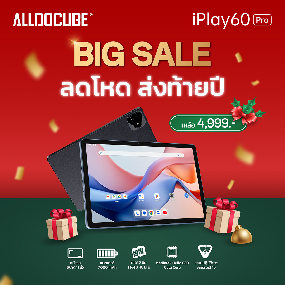 Alldocube มอบราคาพิเศษครั้งนี้เพื่อส่งต่อความสุขเป็นของขวัญส่งท้ายปีเก่าต้อนรับปีใหม่ 2026 ให้ลูกค้าได้สัมผัสแท็บเล็ตจอใหญ่ ใช้งานลื่นใส่ซิมโทรได้เพียง 4,999 บาท จัดเต็มขนาดนี้ ห้ามพลาด! เป็นเจ้าของ Alldocube iPlay 60 Pro ได้ที่ช่องทางออฟไลน์ ร้าน BaNANA และช่องทางออนไลน์ Shopee, LAZADA และ TikTok
