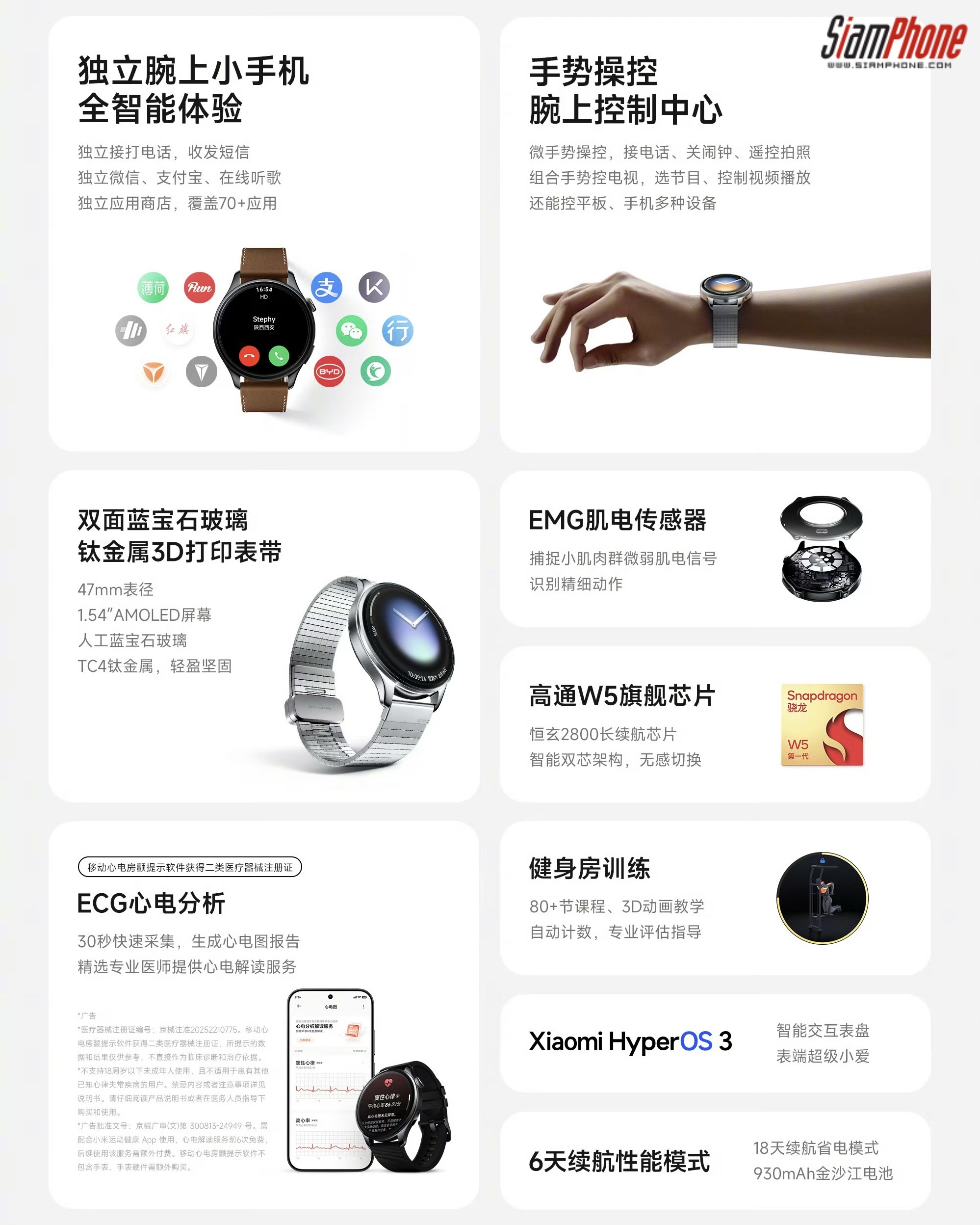 Xiaomi Watch 5 รุ่น eSIM รองรับการใช้งานแบบเชื่อมต่ออิสระ สามารถโทร, ส่งข้อความ, ใช้งานแอปฯ ยอดนิยมอย่าง WeChat และ Alipay ได้โดยไม่ต้องพึ่งสมาร์ตโฟน ซึ่งมีแอปสโตร์ในตัวให้ใช้งานแอปฯ ต่างๆ มากกว่า 70 รายการ รวมทั้งยังรองรับการควบคุมด้วยท่าทางผ่านเซนเซอร์ EMG เช่น การหยิกนิ้วหรือกำมือเพื่อสั่งงานต่างๆ ได้อย่างสะดวก ตัวเรือนผลิตจากสเตนเลสสตีล 316L พร้อมแบตเตอรี่ที่ใช้งานได้ยาวนาน, ระบบปฏิบัติการ HyperOS 3, กันน้ำ 5ATM
