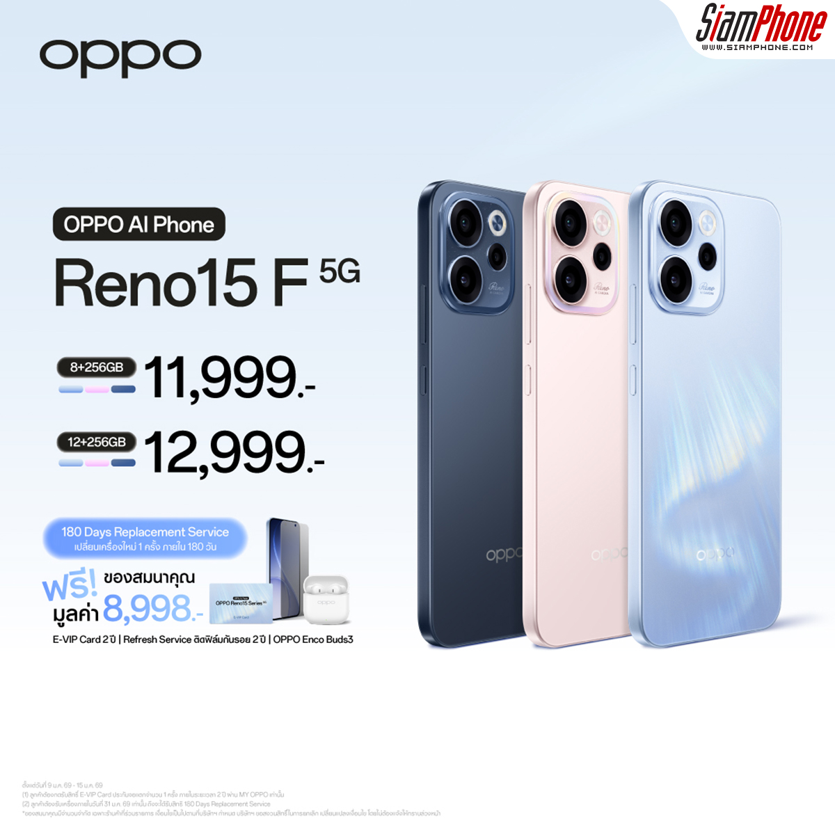 สำหรับผู้ที่สนใจเป็นเจ้าของ OPPO Reno15 Series 5G สามารถสั่งจองเครื่องได้ตั้งแต่วันที่ 9 - 15 มกราคม 2569 โดยผู้ที่รับเครื่องภายในวันที่ 31 มกราคม 2569 จะได้รับสิทธิ์ 180 Days Replacement Service เปลี่ยนเครื่องใหม่ได้ฟรี 1 ครั้ง หากเครื่องเสียหายภายใต้เงื่อนไขประกันภายใน 180 วัน พร้อมกับของสมนาคุณพิเศษอีกมากมาย ดังนี้