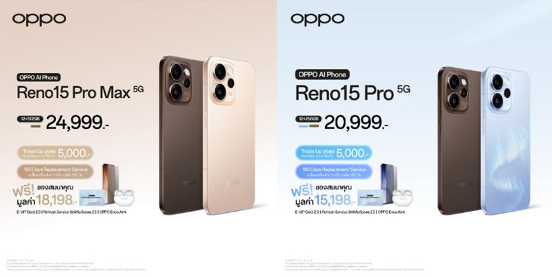 สำหรับ OPPO Reno15 Series 5G วางจำหน่ายในราคา ดังนี้