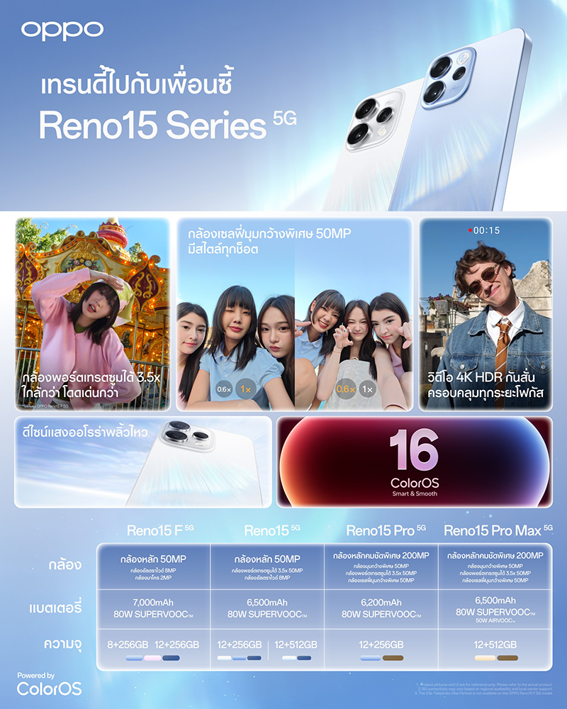 ออปโป้ ไทยแลนด์ เปิดตัว “OPPO Reno15 Series 5G” อย่างเป็นทางการ สมาร์ตโฟนเพื่อนซี้ เทรนดี้ทุกช็อต ครบจบในเครื่องเดียวทั้งการถ่ายภาพและวิดีโอ สานต่อแนวคิด “The Portrait Expert” ยกระดับขีดจำกัดการถ่ายภาพพอร์ตเทรตไปอีกขั้น ชูไฮไลต์กล้องเซลฟี่มุมกว้างพิเศษความละเอียด 50MP มาพร้อมระยะใหม่ 0.6x กว้างที่สุดในอุตสาหกรรม ผสานกล้องพอร์ตเทรตซูมได้ 3.5x ถ่ายทอดภาพบุคคลให้มีมิติ ไวบ์ดี มีสไตล์และเอกลักษณ์ไม่ซ้ำใคร ยกเครื่องระบบปฏิบัติการใหม่ ColorOS 16 และผู้ช่วย AI อัจฉริยะส่วนตัว AI Mind Space รวมข้อมูลและความรู้ส่วนตัวในมือคุณ บนดีไซน์ฝาหลังเอฟเฟกต์แสงออโรร่าพลิ้วไหวสะท้อนการโลดแล่นของแสง โดยเปิดตัวพร้อมกัน 4 รุ่น ได้แก่ OPPO Reno15 F 5G, OPPO Reno15 5G, OPPO Reno15 Pro 5G และใหม่ล่าสุดกับ OPPO Reno15 Pro Max 5G ในราคาเริ่มต้น 11,999 บาท เสริมทัพอีโคซิสเต็มด้วย OPPO Watch S ในราคา 5,999 บาท และ OPPO Pad 5 ในราคาเริ่มต้น 13,999 บาท สัมผัสได้แล้ววันนี้ ณ OPPO Brand Shop ทุกสาขา และตัวแทนจำหน่ายทั่วประเทศ