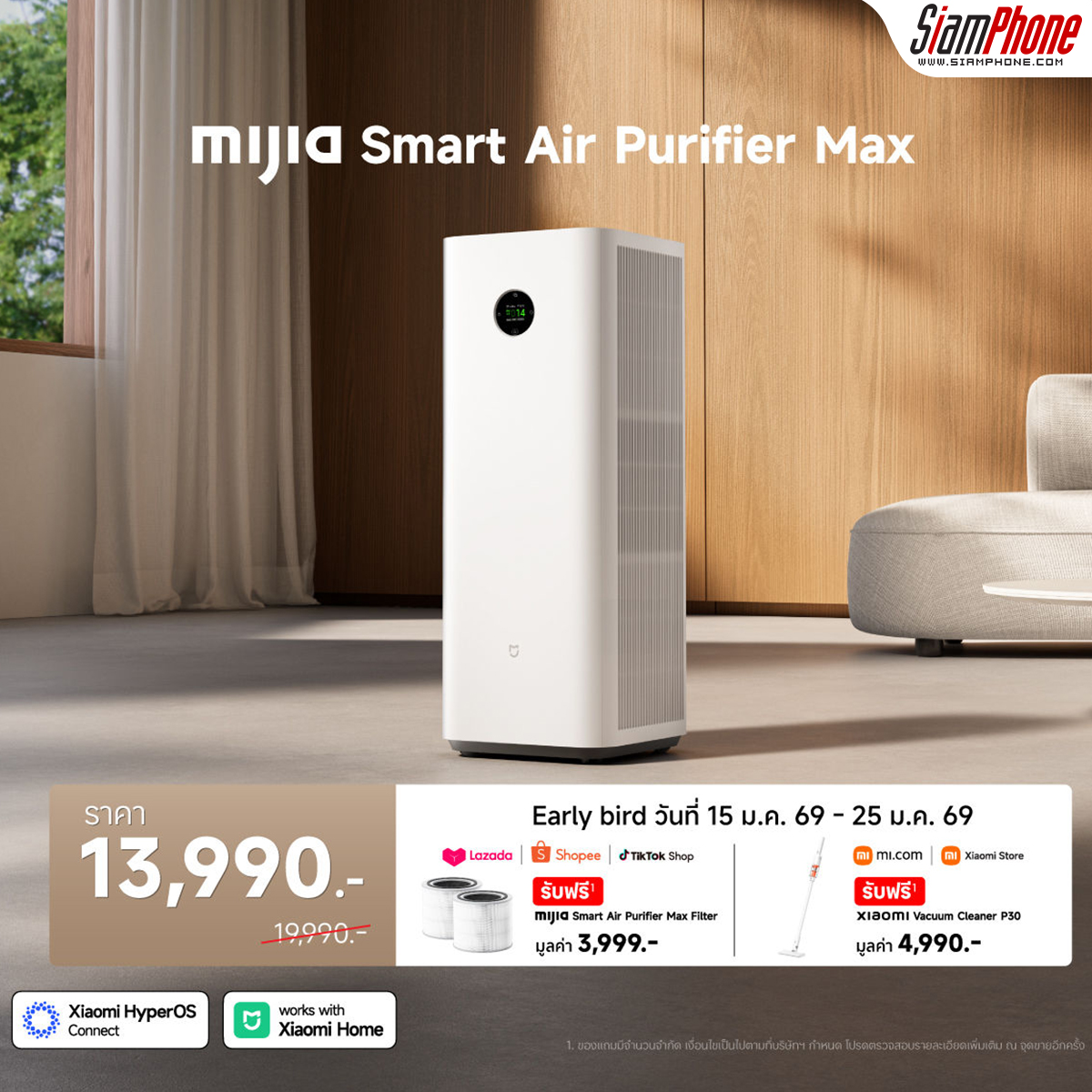 พิเศษ! สำหรับลูกค้าที่ซื้อ เครื่องฟอกอากาศ Mijia Smart Air Purifier Max ตั้งแต่วันนี้ ถึง 25 มกราคม 2569 รับฟรีไส้กรอง Mijia Smart Air Purifier Max Filter มูลค่า 3,999 บาท เมื่อซื้อสินค้าที่ Lazada, Shopee และ TikTok Shop หรือรับฟรี Xiaomi Vacuum Cleaner P30 มูลค่า 4,990 บาท เมื่อซื้อสินค้าที่ mi.com และ Xiaomi Store