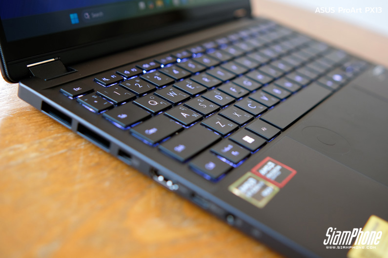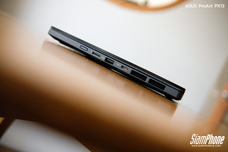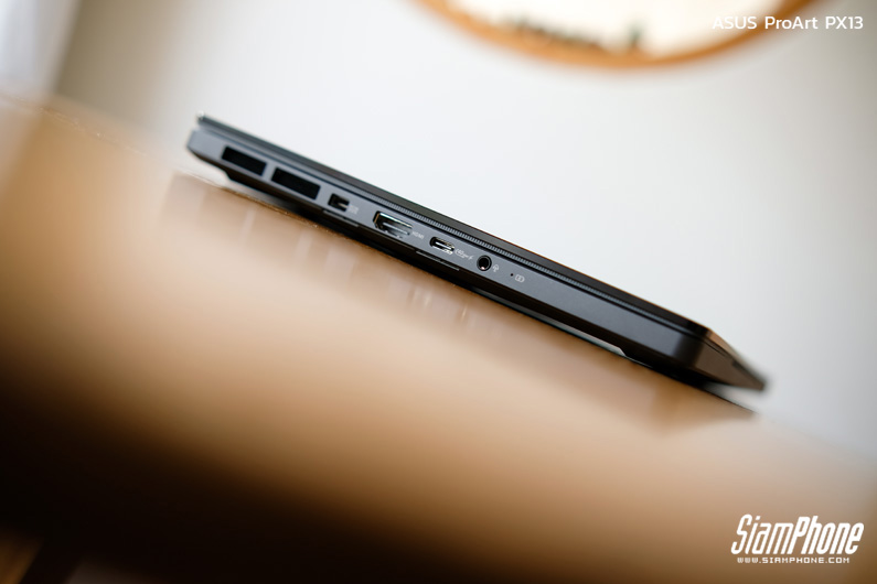 ProArt PX13 ให้พอร์ตเชื่อมต่อมาครบครัน ทั้ง USB-A, USB 4.0 Type-C สองพอร์ต, HDMI 2.1, ช่องหูฟัง 3.5 มม. และ MicroSD Card Reader ช่วยให้เชื่อมต่ออุปกรณ์เสริม กล้อง จอแยก หรือโอนไฟล์งานได้อย่างสะดวก เหมาะกับครีเอเตอร์ที่ต้องทำงานนอกสถานที่โดยไม่ต้องพึ่งดองเกิลจำนวนมาก