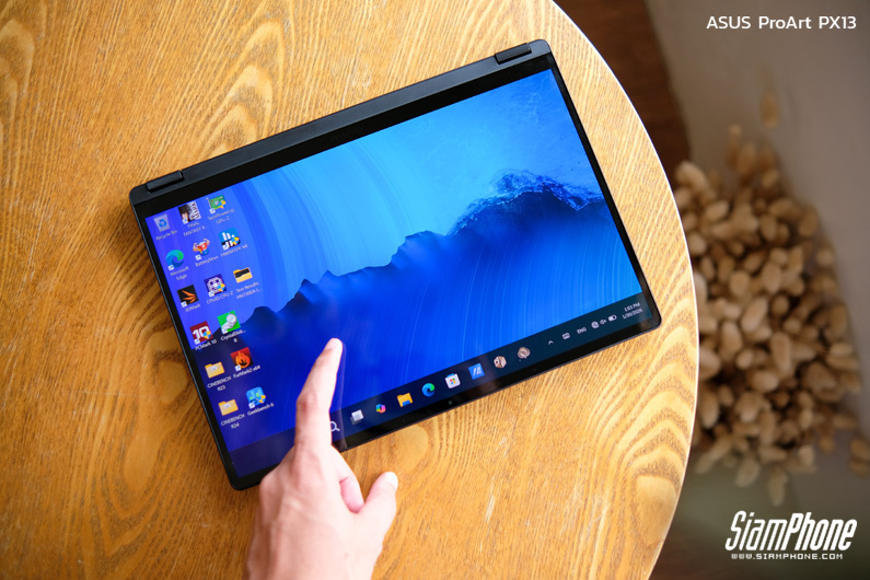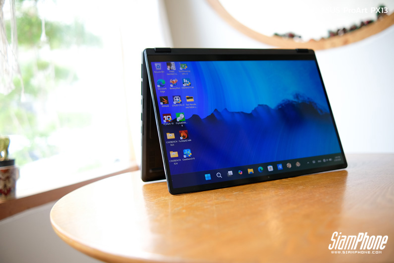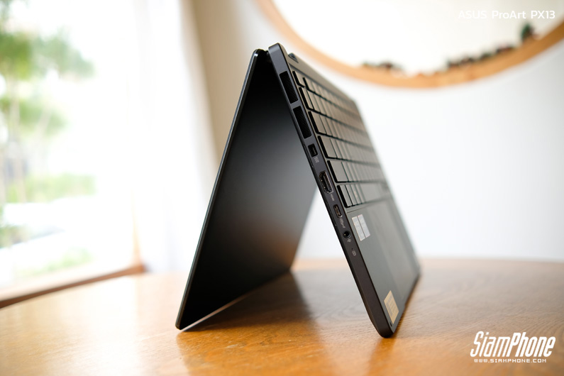 ProArt PX13 มาพร้อมบานพับหน้าจอแบบ 360 องศา ช่วยให้สามารถปรับรูปแบบการใช้งานได้หลากหลาย ทั้งโหมดโน้ตบุ๊กสำหรับทำงานทั่วไป โหมดแท็บเล็ตสำหรับวาดหรือเขียน โหมดเต็นท์สำหรับพรีวิวผลงาน และโหมดสแตนด์สำหรับการนำเสนอหรือรับชมคอนเทนต์ เพิ่มความยืดหยุ่นในการใช้งานจริง เหมาะกับครีเอเตอร์ที่ต้องสลับรูปแบบการทำงานตามสถานการณ์และสถานที่อยู่ตลอดเวลา