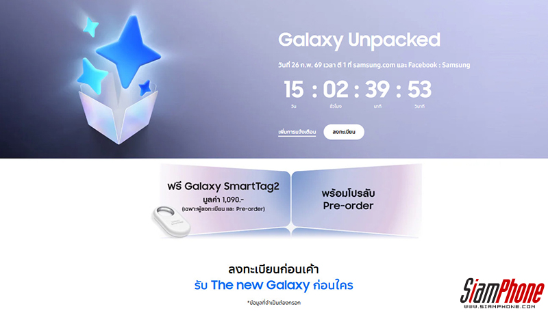 Samsung ประกาศจัดงาน Galaxy Unpacked ในวันที่ 26 กุมภาพันธ์ 2026 เวลา 01.00 น. ตามเวลาในประเทศไทย ซึ่งคาดว่าจะเป็นงานเปิดตัวของ Samsung Galaxy S26 Series ว่าที่สมาร์ตโฟนระดับเรือธงรุ่นใหม่ของค่ายประจำปี 2026 และแน่นอนว่า Samsung ประเทศไทยไท่รอช้า เปิดให้ลงทะเบียนความสนใจล่วงหน้าทันที ซึ่งใครที่ลงทะเบียนความสนใจ และ Pre-Order รับไปเลย Galaxy SmartTag2 มูลค่า 1,090 บาท และโปรลับสำหรับคนที่พรีออเดอร์เท่านั้น