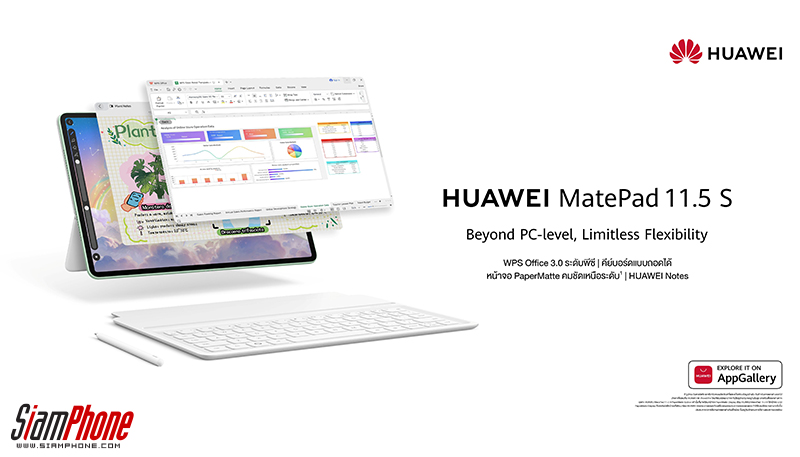 HUAWEI MatePad 11.5 S 2026 รุ่น Wi-Fi (12GB+256GB) จำหน่ายในราคาสุดคุ้มเพียง 16,990 บาท มีให้เลือก 2 สี ได้แก่ สี Green และสี Space Gray และพิเศษหากซื้อในช่วงโปรโมชั่น ระหว่างวันที่ 17 กุมภาพันธ์ 2569 – 24 กุมภาพันธ์ 2569 รับไปเลยประสบการณ์ PC-Like แบบครบเซ็ตในมูลค่ารวมทั้งหมด 20,230 บาท ได้แก่ HUAWEI Smart Keyboard มูลค่า 4,990 บาท, HUAWEI M-Pencil 3 มูลค่า 4,490 บาท, HUAWEI Bluetooth Mouse มูลค่า 1,490 บาท และ 40W SuperCharge Power Adapter มูลค่า 1,290 บาท นอกจากนี้ยังติดตั้งโปรแกรมให้ฟรี ได้แก่ WPS Office 3.0 มูลค่า 3,990 บาท, HUAWEI Notes มูลค่า 1,990 บาท และ GoPaint App มูลค่า 1,990 บาท พิเศษยิ่งกว่าสำหรับลูกค้าเก่าแลกใหม่ รับส่วนลด 2,000 บาท เพิ่มเติมจากราคาประเมิน สามารถสั่งซื้อได้ที่ HUAWEI Experience Store และร้านค้าที่ร่วมรายการทั้งออฟไลน์และออนไลน์ รวมถึง HUAWEI Store และร้านค้าอย่างเป็นทางการของหัวเว่ยบนแพลตฟอร์ม Lazada, Shopee และ TikTok Shop