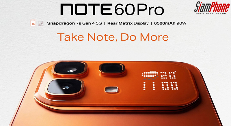 Infinix Note 60 Pro สมาร์ตโฟนรุ่นใหม่จากค่าย Infinix มาพร้อมลูกเล่นหน้าจอ Matrix ที่ถูกติดตั้งอยู่บนโมดูลกล้องหลัง โดยหน้าจอ Matrix สามารถรับการแจ้งเตือน, ปรับแต่งเป็นอิโมจิ หรือสัตว์เลี้ยงพิกเซล นอกจากนี้ยังใช้เป็นมินิเกมเช่น Dot Dash และ Star Blast ส่วนหน้าจอแสดงผลใช้พาแนล OLED กว้าง 6.78 นิ้ว ความละเอียด 2436x1080 พิกเซล อัตรา Refresh Rate สูงสุด 144Hz ปรับความสว่างได้สูงสุด 4500nits และครอบทับด้วยกระจก Gorilla Glass 7i นอกจากนี้หน้าจอยังรองรับสแกนลายนิ้วมือบนหน้าจอ และข้างตัวเครื่องมีปุ่มพิเศษใช้เป็นที่วัดการเต้นของหัวใจ กับวัดค่าออกซิเจนในเลือด สามารถดูค่าได้ผ่านทางแอพฯ My Health App