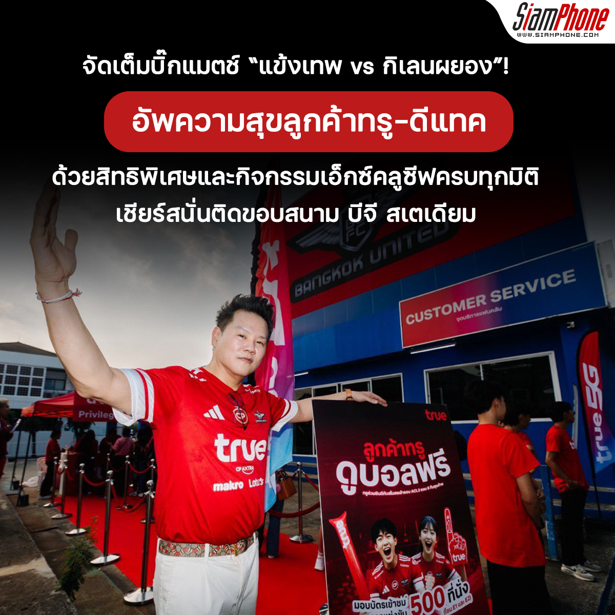 นำโดย นายขจร เจียรวนนท์ ประธานสโมสรทรู แบงค็อก ยูไนเต็ด พร้อมด้วย บมจ.ทรู คอร์ปอเรชั่น โดย นายโอลิเวอร์ กิตติพงษ์ วีระเตชะ หัวหน้าคณะผู้บริหารด้านแบรนด์และมีเดีย ร่วมส่งพลังไปกับแฟนบอลที่พร้อมใจกันเชียร์สุดเสียงตั้งแต่นกหวีดแรก ทำให้บรรยากาศในสนามคึกคัก และสมศักดิ์ศรี “บิ๊กแมตช์ของจริง” พร้อมกันนี้ ทรูยังอัพสัญญาณ ทรู5G ให้ครอบคลุมทุกโซนของทรู บีจี สเตเดียม รองรับการใช้งานของแฟนบอลอย่างเต็มประสิทธิภาพ ทั้งการไลฟ์ แชร์โมเมนต์ และอัปโหลดความมันแบบเรียลไทม์ ด้วยสัญญาณแรงเร็ว เสถียรตลอดการแข่งขัน