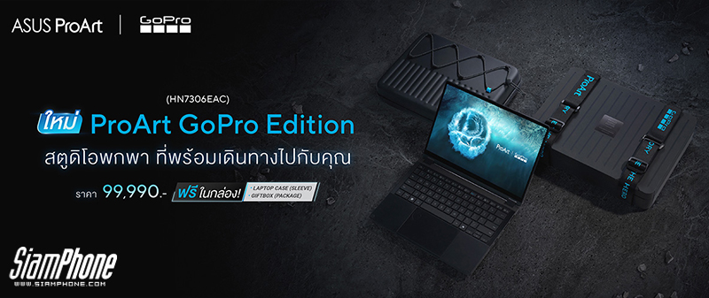 ProArt GoPro Edition (HN7306EAC-GOPRO073WA) วางจำหน่ายในราคา 99,990 บาท มาพร้อมการรับประกันบริการซ่อมถึงที่ 3 ปี (On-Site Service), ประกันระหว่างประเทศกว่า 80 ประเทศทั่วโลก 3 ปี และประกันอุบัติเหตุ 1 ปีแรก (Perfect Warranty) พร้อมด้วย Windows 11 Home และ Microsoft Office Home 2024 พิเศษพร้อมด้วย Microsoft 365 Basic ฟรี 12 เดือน พร้อมรับสิทธิ์ใช้ GoPro Premium+ ฟรี 12 เดือน ผู้ที่สนใจสามารถสั่งซื้อสินค้าได้แล้ววันนี้ ณ ร้านค้าไอทีชั้นนำทั่วประเทศ และช่องทางออนไลน์ ASUS Official Store