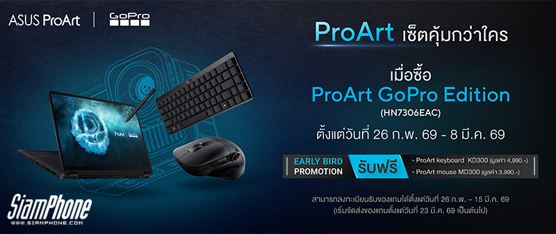ASUS ยังจัดโปรโมชัน Early Bird สำหรับลูกค้าที่ซื้อสินค้าระหว่างวันที่ 26 กุมภาพันธ์ – 8 มีนาคม 2569 (รวมการสั่งซื้อในงาน COMMART วันที่ 5-8 มีนาคม 69) รับฟรีของพรีเมียมสุดเอ็กซ์คลูซีฟ รวมมูลค่ากว่า 8,900 บาท ได้แก่ ProArt Keyboard KD300 มูลค่า 4,990 บาท และ ProArt Mouse มูลค่า 3,990 บาท