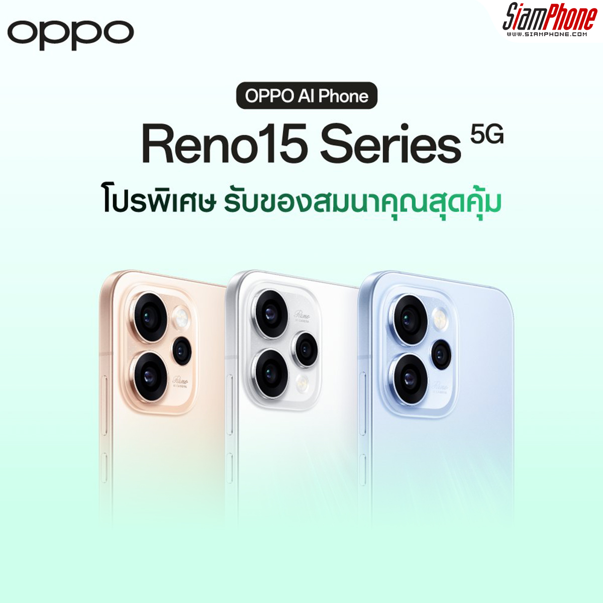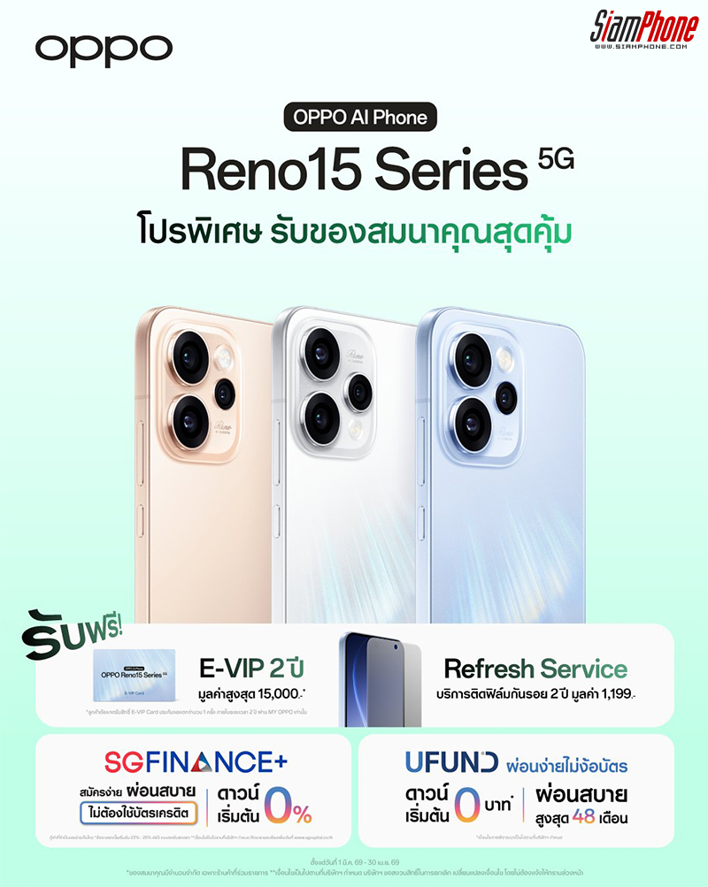 เมื่อซื้อ OPPO Reno15 Series 5G ระหว่างวันที่ 1 มีนาคม 2569 ถึงวันที่ 30 เมษายน 2569 นี้ รับทันทีของสมนาคุณมูลค่าสูงสุด 16,199 บาท! ที่ OPPO Brand Shop และตัวแทนจำหน่ายทั่วประเทศ ห้ามพลาดโอกาสเป็นเจ้าของสมาร์ตโฟนเพื่อนซี้ เทรนดี้ทุกช็อต พร้อมของแถมสุดคุ้ม!